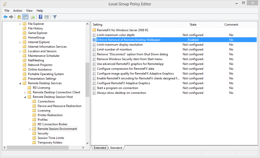 Since the websites are not hosted by microsoft, the links may change without notice. 12/10/2015 · so it looks like this is my solution: Type gpedit.msc and press enter. 08/05/2014 · navigate to computer config/policies/admin templates/windows components/remote desktop services/remote desktop session host/remote session environment; The command is given below.